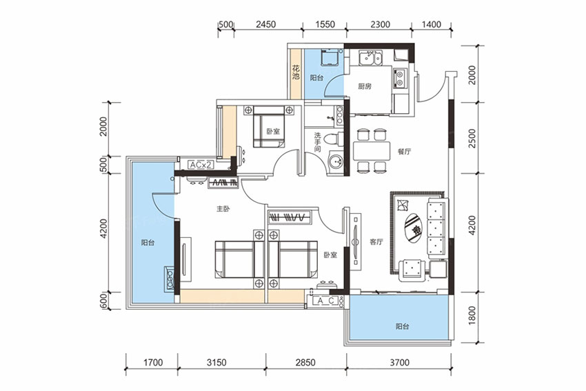 衡阳珠江愉景豪庭3室2厅1卫H户型(南侧东西边户)图鉴赏-看好房