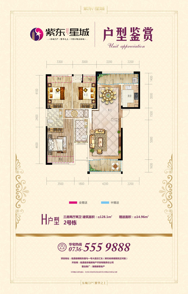 临澧紫东星城3室2厅2卫H户型 图鉴赏-看好房