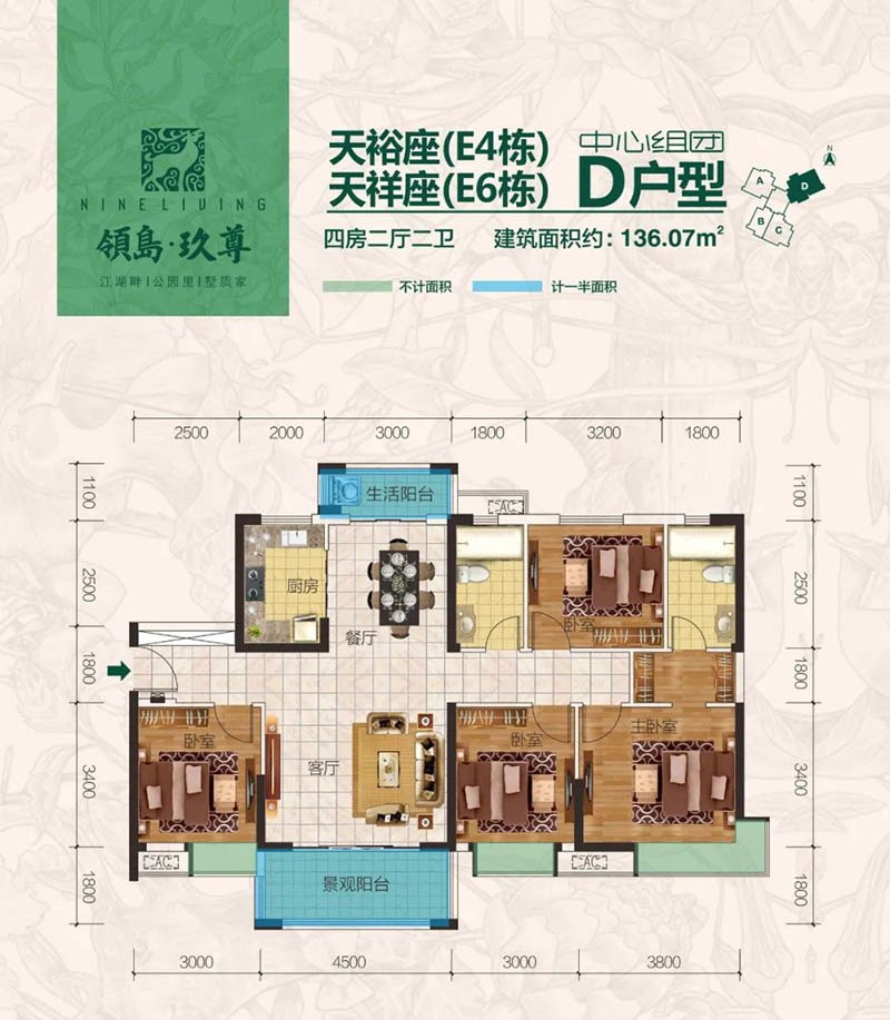 岳阳领岛玖尊4室2厅2卫E6栋D户型图鉴赏-看好房