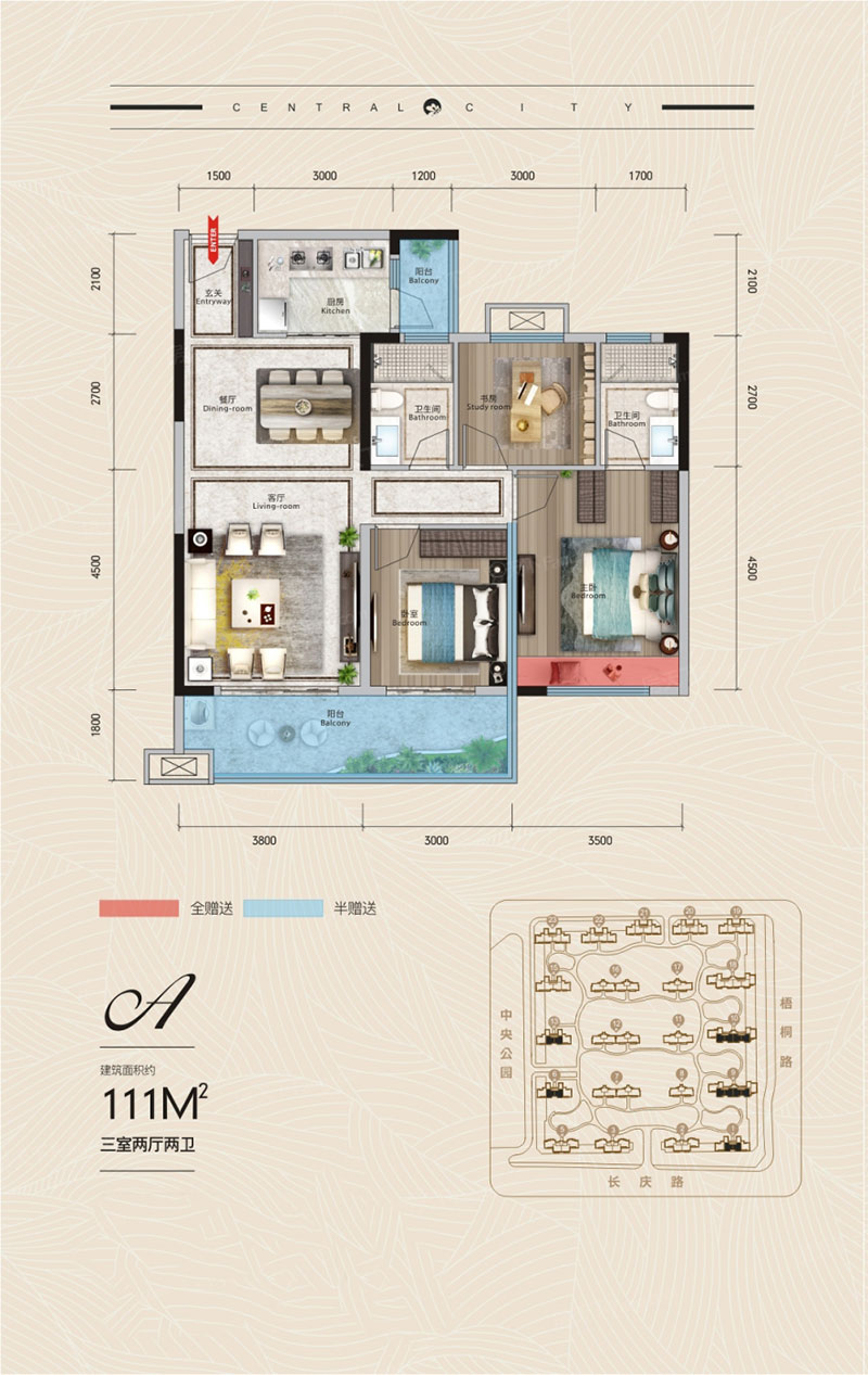 醴陵爱琴海中央城3室2厅2卫A户型图鉴赏-看好房