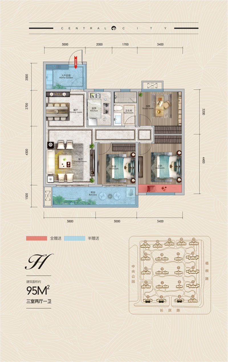 醴陵爱琴海中央城3室2厅1卫H户型图鉴赏-看好房